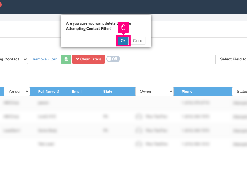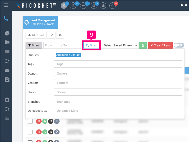 1. To create a Saved Filter on the Lead Management Page, start by clicking Filters