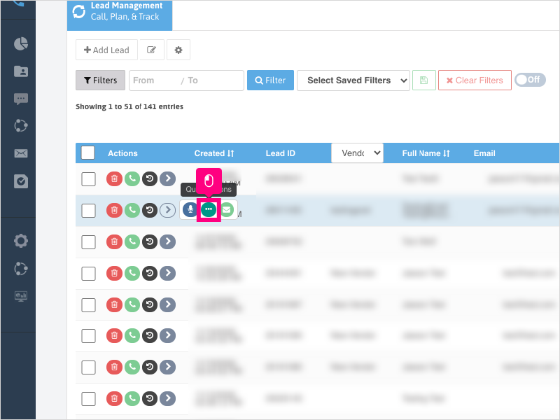 1. To send a text message to a lead from the Lead Management Page, first, scroll to the lead you want to text, hover over the arrow and click on Quick Actions