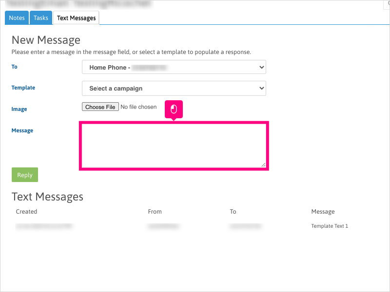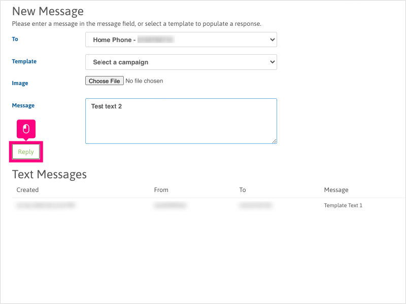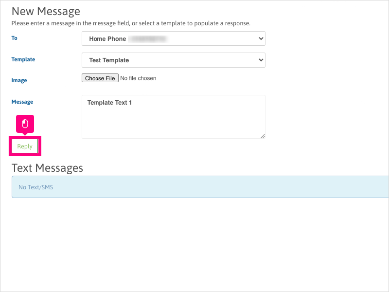 5. If you selected a Text Template from the dropdown, the message will automatically append to the "Message" section. Edit as needed or if you're ready to respond, Click Reply