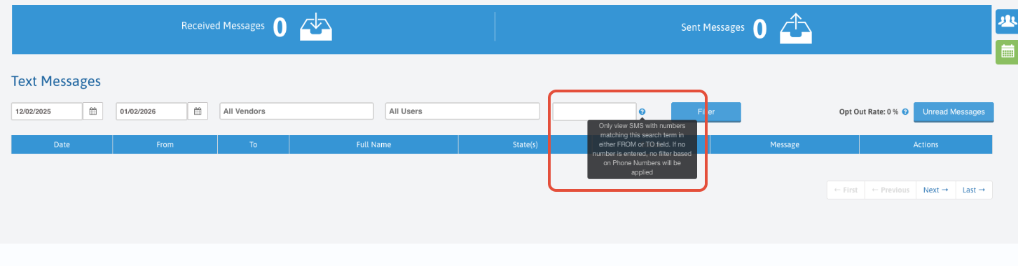 This article walks through how to narrow text message results in the Text Messaging dashboard by entering a phone number or user into the search field, allowing all users to quickly locate relevant inbound or outbound messages.