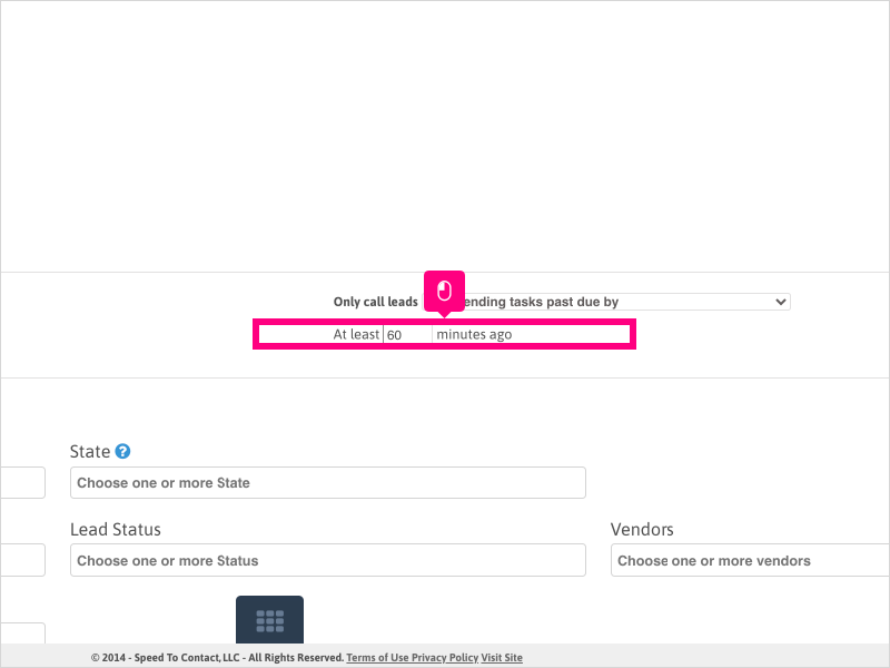 13. Select without pending tasks or task past due by to include leads that do not have a pending task OR have a task that is past due (not marked as completed) by a certain timeframe (in minutes).