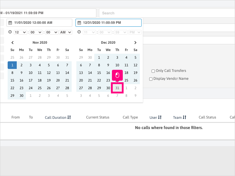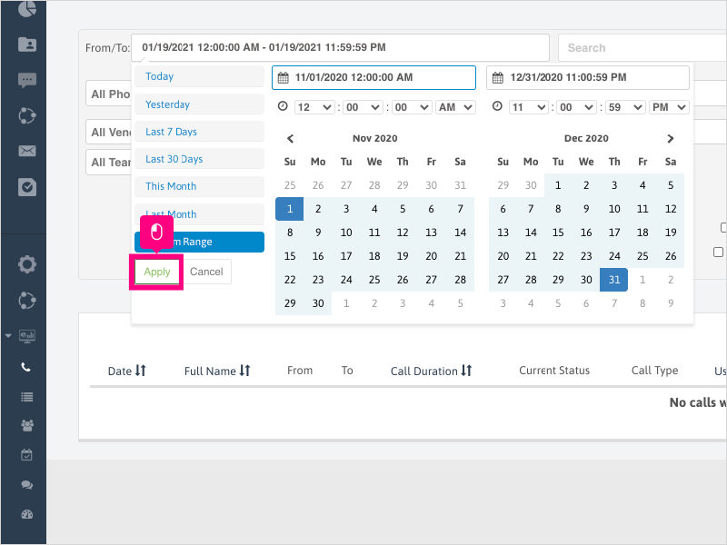 3. The From/To calendar option allows you to select a date range for the Call History Report for a maximum of 1 year timespan over any period of time.