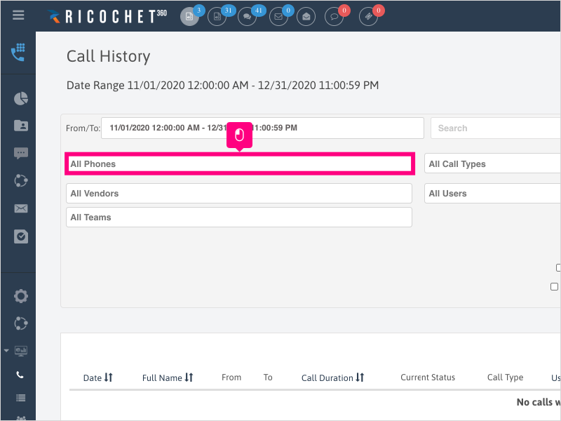 9. Click the All Phones box if you want to filter by a specific phone number inside Ricochet.