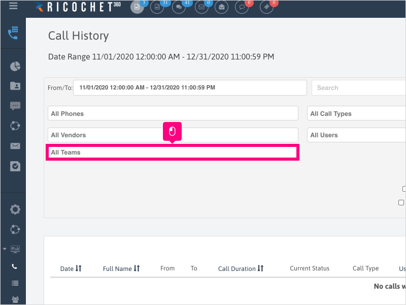 15. Click the All Teams box if you want to filter by a specific Teams in Ricochet.