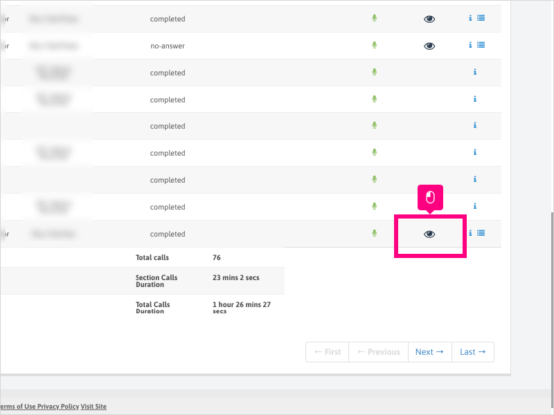 26. Click the microphone icon under the "Listen" column - a new tab will open and play the call recording.
