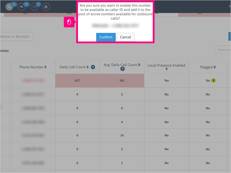 7. When you toggle a number to be monitored by Spam Guru, you'll be presented with a prompt indicating that the number will be enabled for Local Caller ID and added to the pool of available numbers for outbound calls.