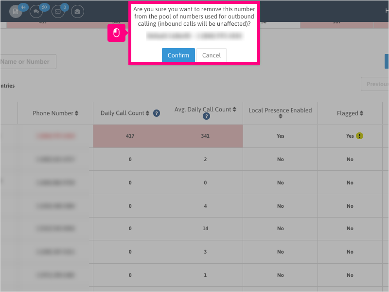 9. The prompt that appears will ask if you want to remove the number from the pool of numbers used for outbound calling (as monitored by Spam Guru - Local Caller ID will still be enabled).